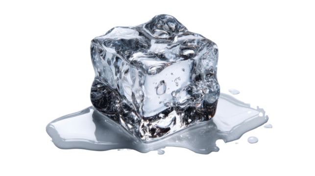 Ice cube slowly melting, forming a small clear puddle of water, dissolving on a transparent background