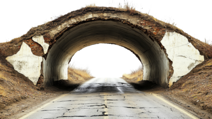 Crumbling concrete tunnel leading to transparent background on a damaged road