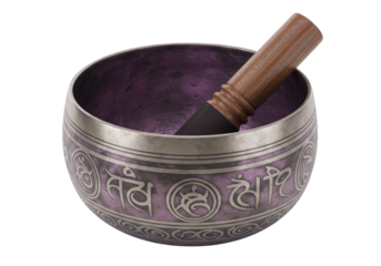 Isolated singing bowl with wooden striker tool for meditation sound healing instrument