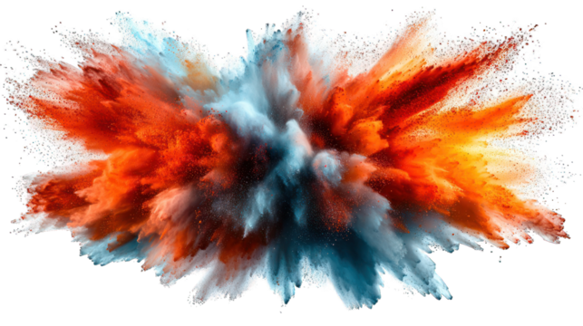 Abstract explosion of vibrant, multicolored powder.  A chaotic burst of orange, red, blue, and white particles