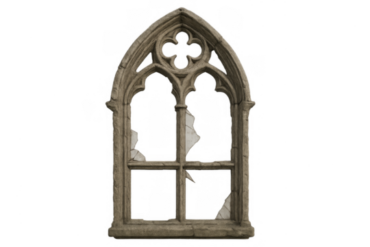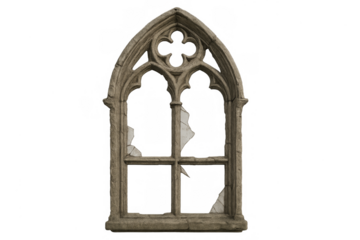 Three architectural design Gothic windows in a row, a window with a door, and two arched windows on display