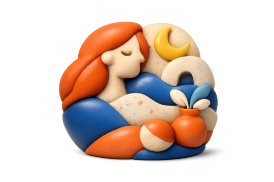 Whimsical cartoon head with pastel lilac hair on transparent background