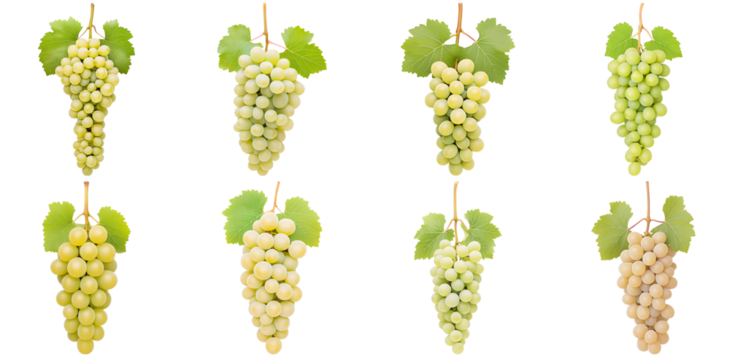 Collection of various white grapes like Chardonnay, Riesling, showcasing their soft, translucent appearance isolated on white transparent background PNG set