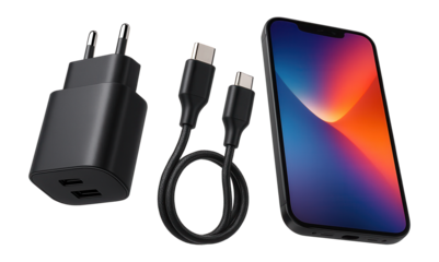 Minimal mobile phone charger with USB cable and smartphone.