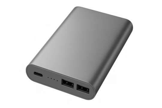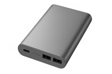 Modern gray power bank with usb ports isolated on transparent background, offering portable charging solution for electronic devices