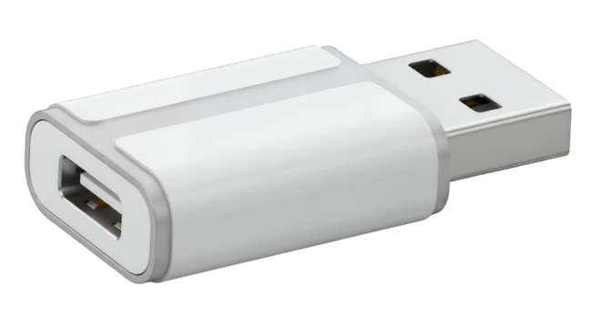 Realistic white USB-A to USB-C adapter, a compact data transfer and charging converter, essential modern electronic accessory isolated on transparent background
