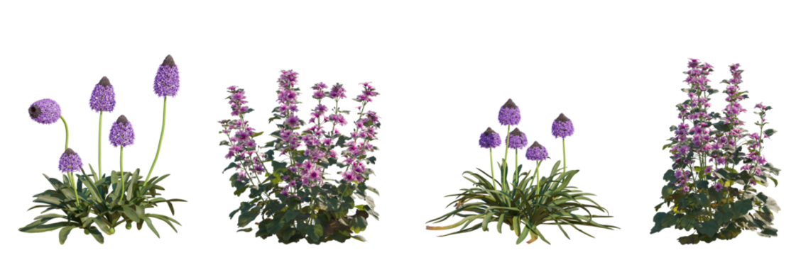 Set of Malva sylvestris and Scilla peruviana (the Portuguese squill) flowering  frontal isolated png on a transparent background perfectly cutout high resolution
