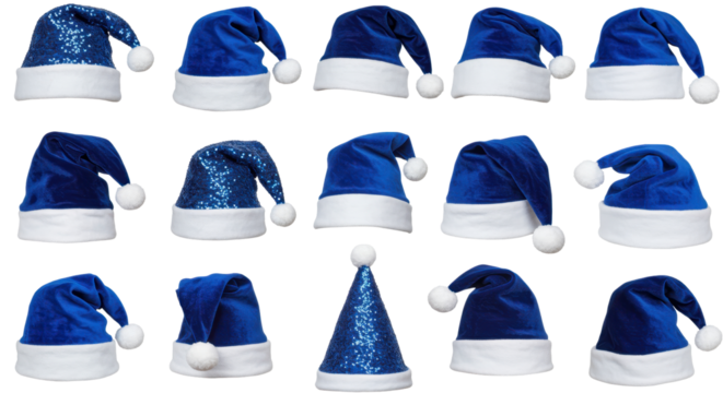 Festive Array of Christmas Caps: A vibrant arrangement of blue and white Christmas hats with charming pom-poms, embodies the holiday spirit, ready for seasonal cheer.