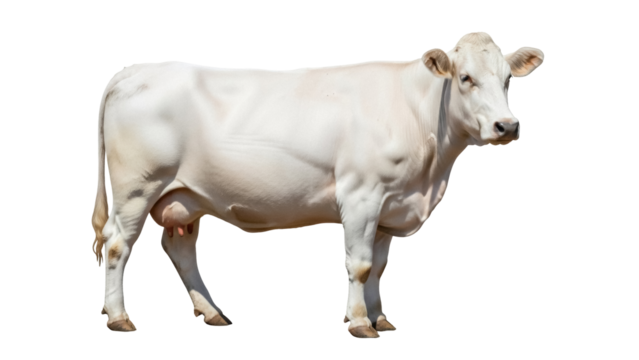Charolais cow isolated on white background, solid cream-colored beef cattle portrait, farm livestock animal standing, purebred Charolais breed cutout, high-quality cow image for agriculture and ranch
