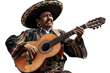 A Mexican musician in traditional attire plays guitar, wearing a sombrero and enjoying the music. Isolated on a white background.