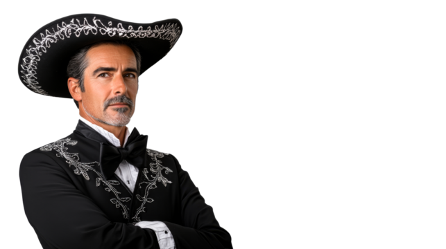 Hispanic man wearing charro suit and sombrero, cut out transparent