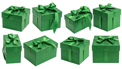Eight green gifts adorned with satin ribbon bows on black background