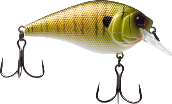 Crankbait for freshwater fishing with two treble hooks and shadow behind