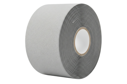 Roll of grey self-adhesive foam insulation tape for sealing gaps isolated on a transparent background