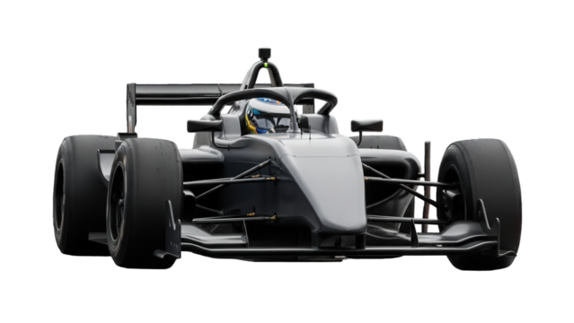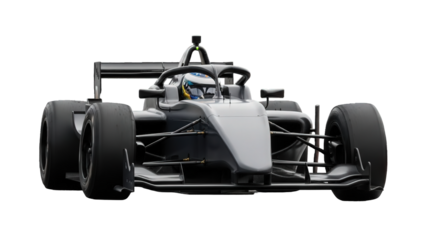 A powerful gray formula race car, embodying the dynamic spirit of winter sport, is isolated on a clean white background.