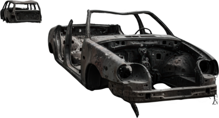 Burnt out car wreck stripped chassis and vehicle frame detailed view isolate