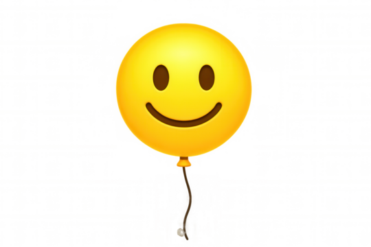 Smiling yellow emoji balloon showing happiness and positive emotion on transparent background, celebrating party fun