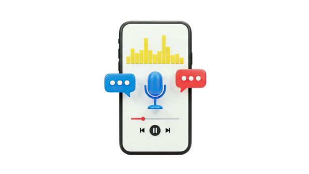Smartphone with microphone, chat bubbles, and audio visualizer