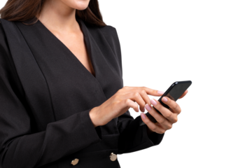 Closeup of woman using smartphone, isolated on white background with abstract speech bubbles and geometric elements, concept of communication