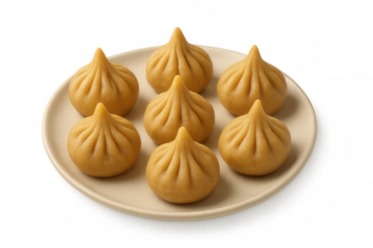 Indian modak sweet dumplings on a plate, traditional festive dessert for ganesh chaturthi celebration on transparent background