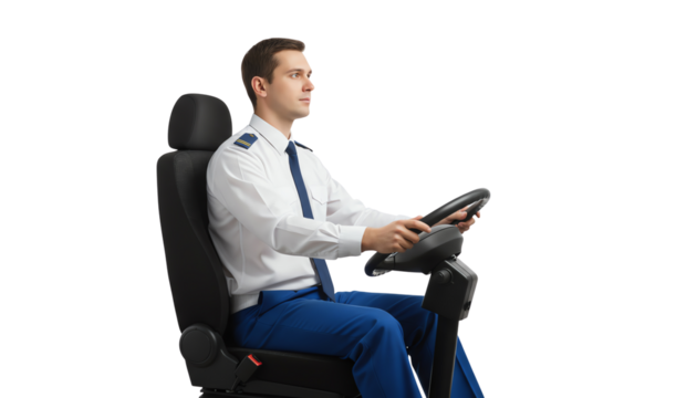 Professional male driver sitting in a vehicle seat, focused and ready to drive.