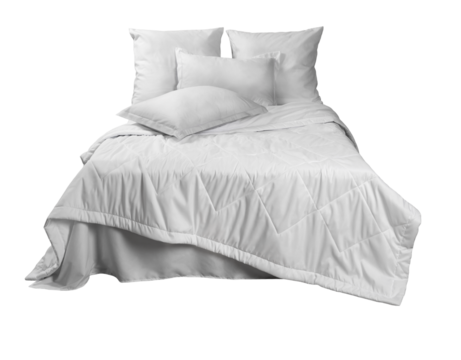 a bed with white pillows and a blanket, a mock-up for a bedroom design, isolated