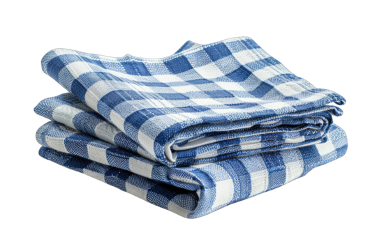 Blue and white checkered cotton folded kitchen towel, isolated on transparent background