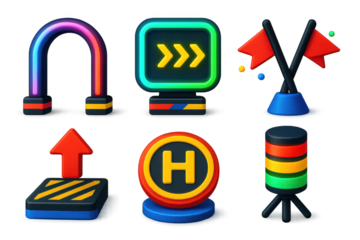Drone Race Course Icons. 3D icon set of drone race course elements: LED-lit gates, speed traps, checkpoint flags, launch pad,