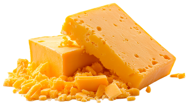 Block of Cheddar Cheese with Slices and Crumbs - Aged cheddar block with cut slices and natural crumbs on transparent background