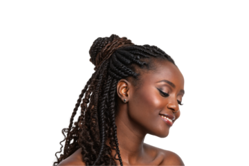 A black woman with neatly styled braids, looking downward with a serene expression. Her glossy lips and defined cheekbones accentuate her glowing complexion, isolated on a transparent background