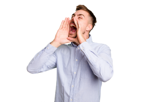 Excited young Asian man in casual shirt holding soccer ball and smartphone with blank screen, celebrating his victory isolated on transparent background