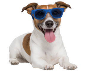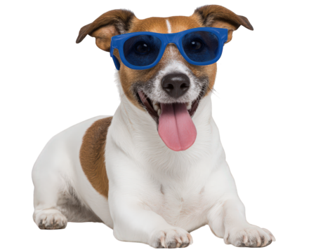 Playful dog wearing blue sporty sunglasses, happy expression, brown and white fur, sitting on transparency background, cheerful pet, tongue out, fun and energetic mood