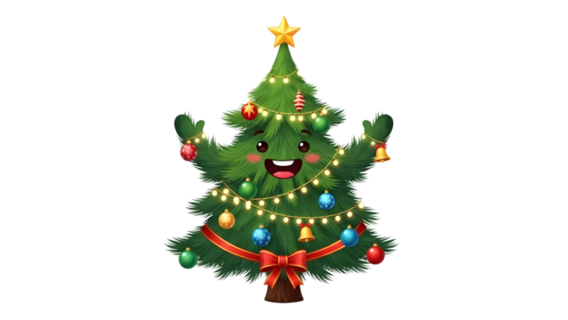 Joyful cartoon Christmas tree character decorated with bright ornaments and glowing string lights ready for the holidays