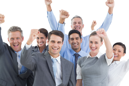 Smiling businesswoman looking at camera at seminar with her colleagues near by on a transparent background