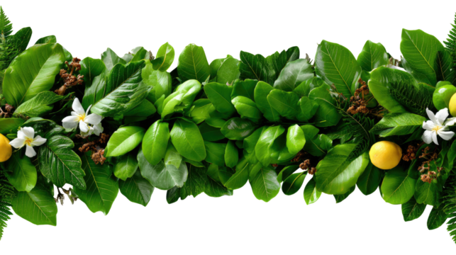 Lush Green Garland: A vibrant garland comprised of various types of green leaves, delicate white flowers, and cheerful yellow fruit.