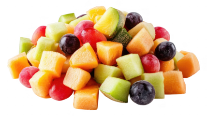 Fresh fruit salad featuring a colorful mix of melons, berries, and grapes on a white background