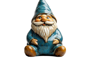 Colorful ceramic garden gnome sitting with cheerful expression and detailed features