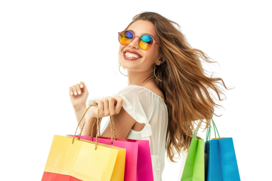 Cheerful happy woman enjoying shopping, isolated white background PNG