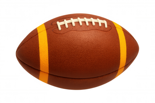 Close-up of a brown American football.  Stitched leather cover, prominent white laces and lines.  3D rendered image, isolated