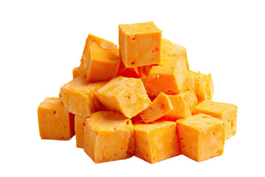 A pile of yellow cheese cubes on a white background, perfect for appetizers and snacks.