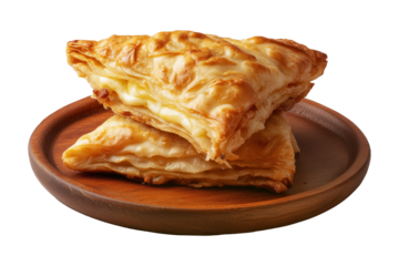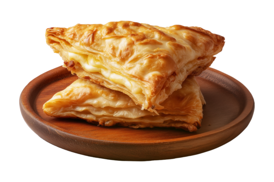 Flaky filled puff pastries pocket with melted cheese oozing out on wooden plate, isolated on white transparent background, concept of Brazil snack