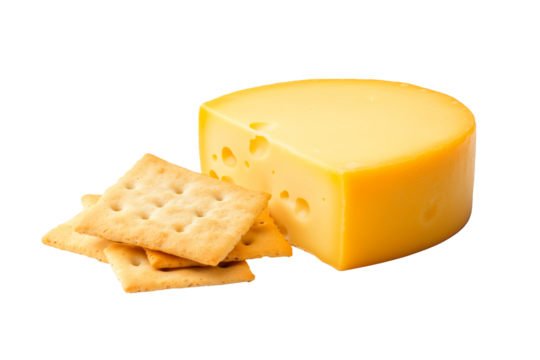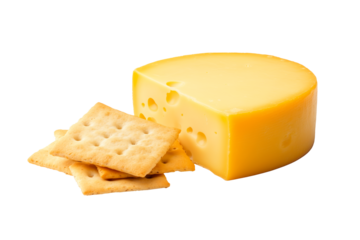 Assorted cheese blocks and slices with crackers and fresh rosemary isolated on white transparent background. Concept of appetizers and snacks