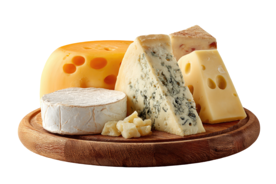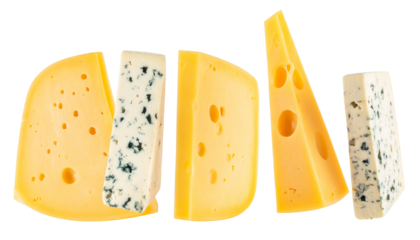 Assorted cheese blocks including blue, gouda, and cheddar isolated on white transparent background. Concept of dairy products and gourmet food selection
