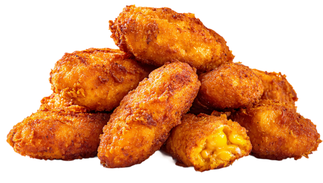 A pile of golden brown fried mac and cheese bites on a  isolated on transparent background