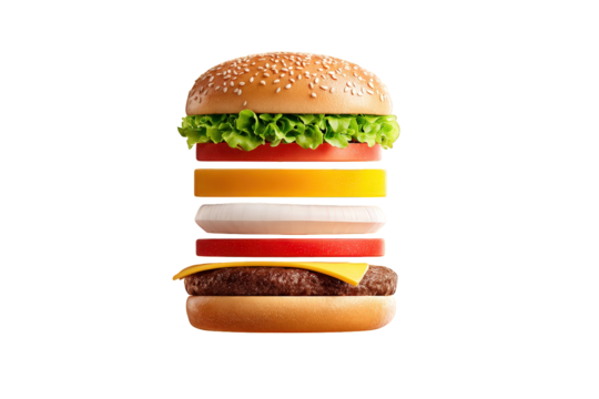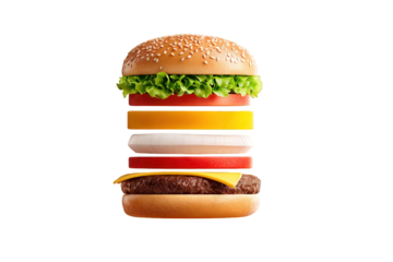 Stacked Hamburger with Lettuce Tomato Cheese Onion and Bun on Transparent Background