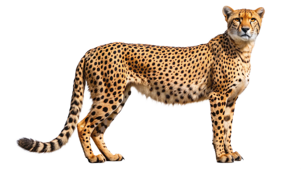 Agile cheetah frozen in mid-step from side view, sharp spot patterns, lithe muscles, real look, full view, on white background, 4k, unique, no blur, clear view