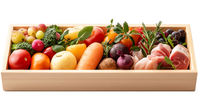 A vibrant selection of fresh vegetables and delicacies arranged neatly in a wooden box, showcasing the beauty and variety of nature's bounty in a colorful presentation.