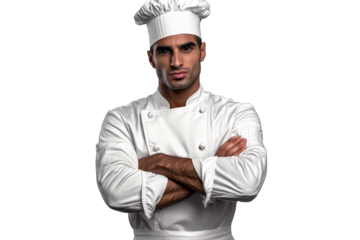 Chef with arms crossed, white uniform, serious facial expression, cut out transparent