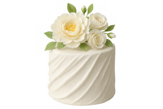 Elegant wedding cake decorated with white sugar flowers and buttercream icing, celebrating marriage and special events
