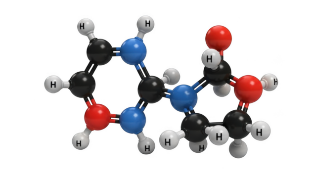 3 D molecular model of Guanine with attached side chain showing atoms and bonds isolated on a transparent background